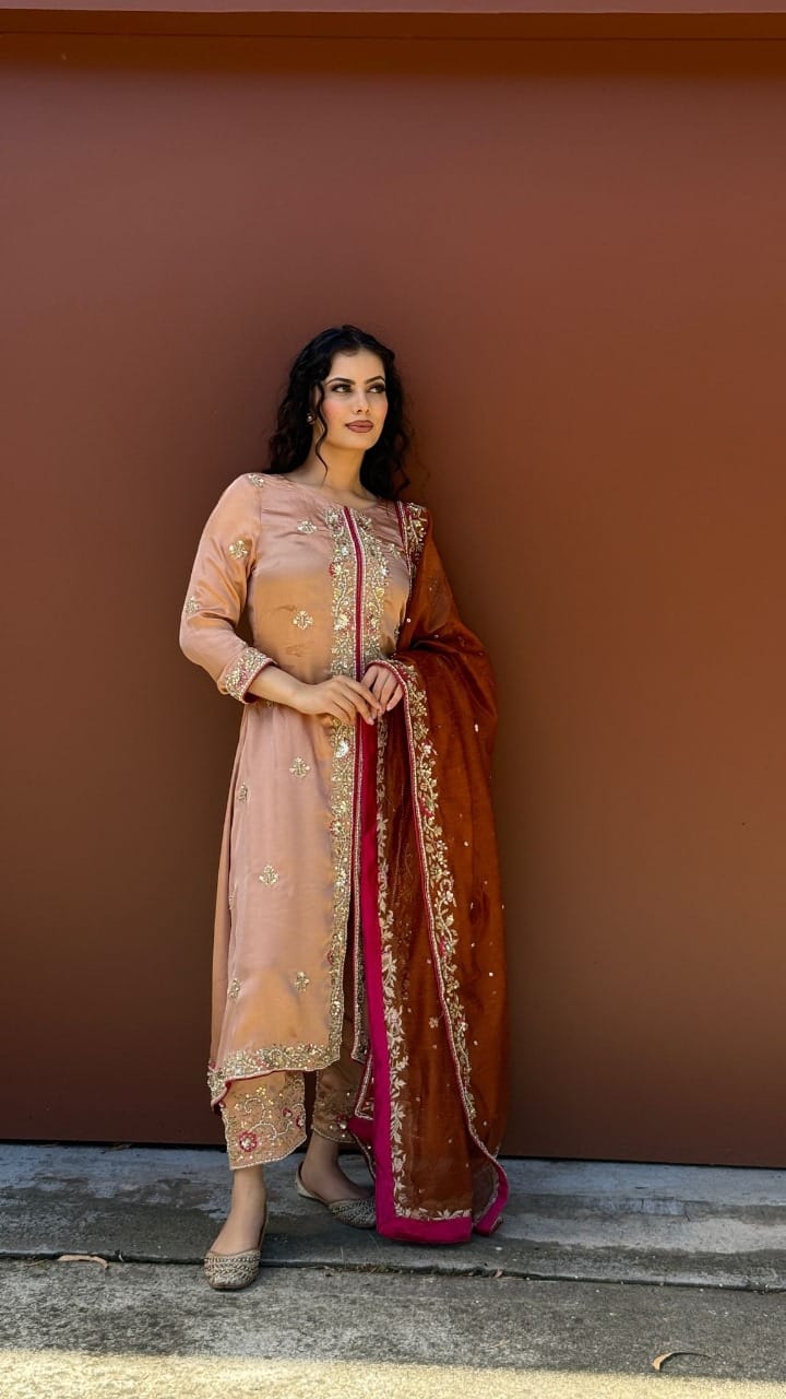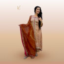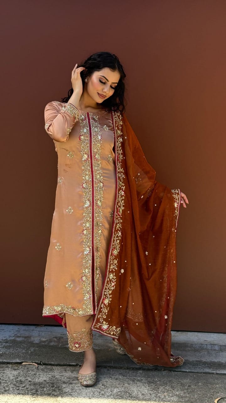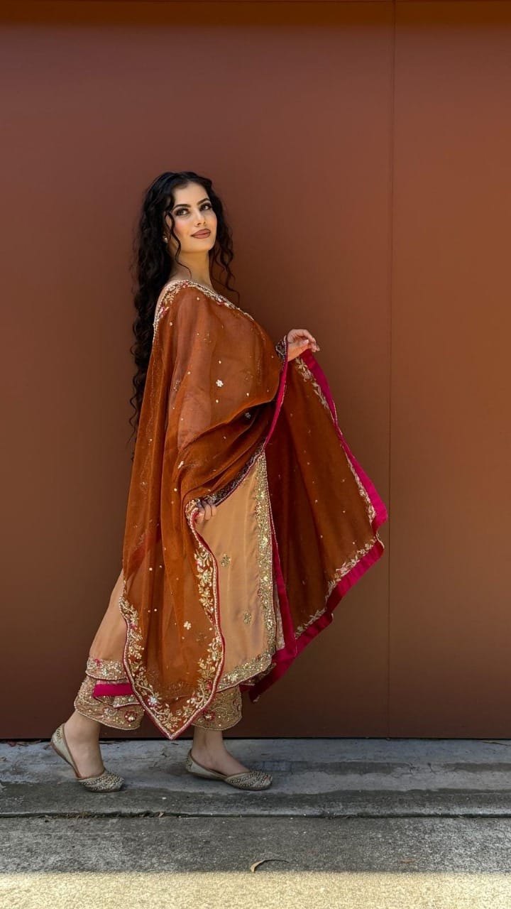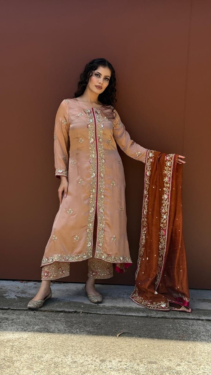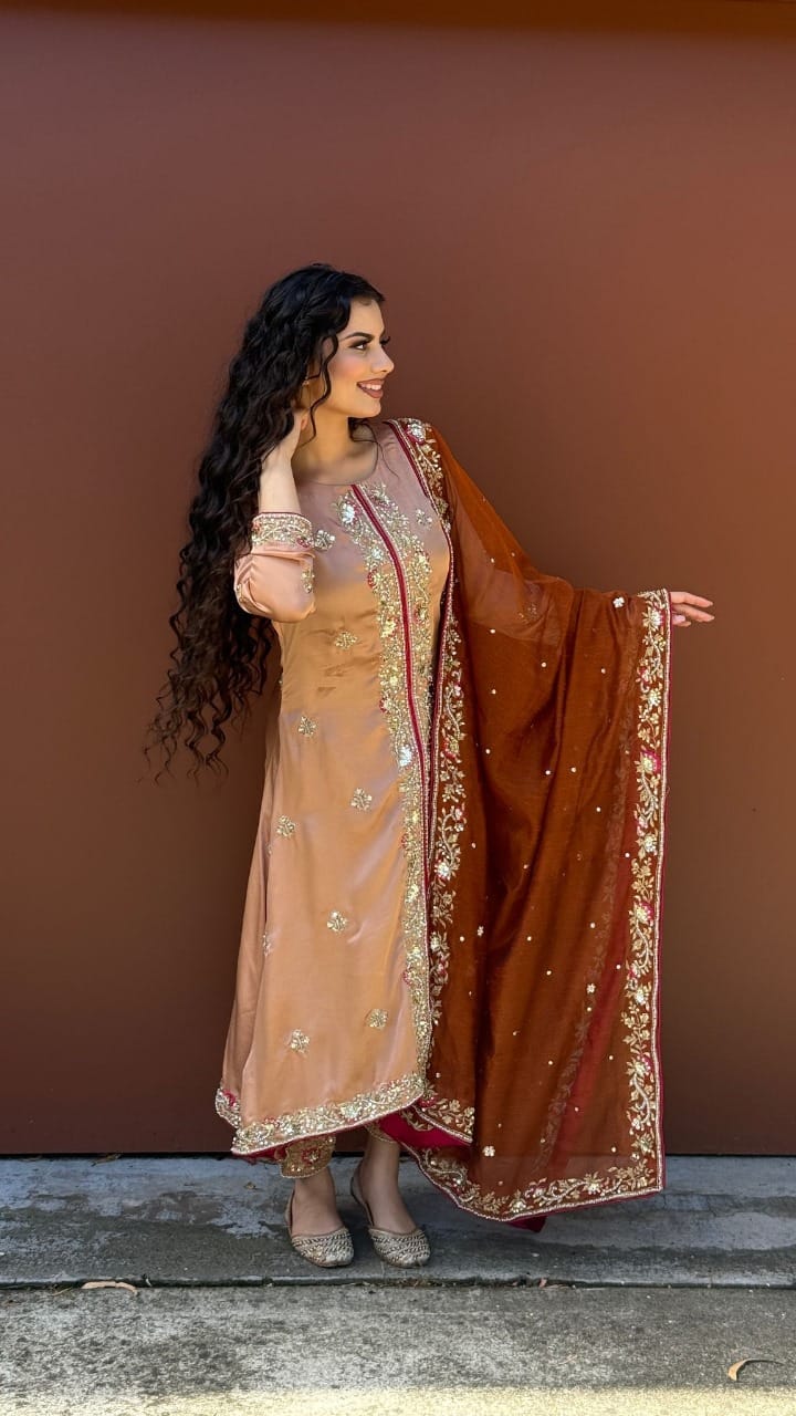 Featuring a soft beige fabric and a stunning rust-brown dupatta with intricate finishing patti work, this ensemble is adorned with delicate sequence, shining pearls, and dabka accents. The charming small bootis add a unique touch, making this outfit perfect for festive celebrations. Shine with grace and style!