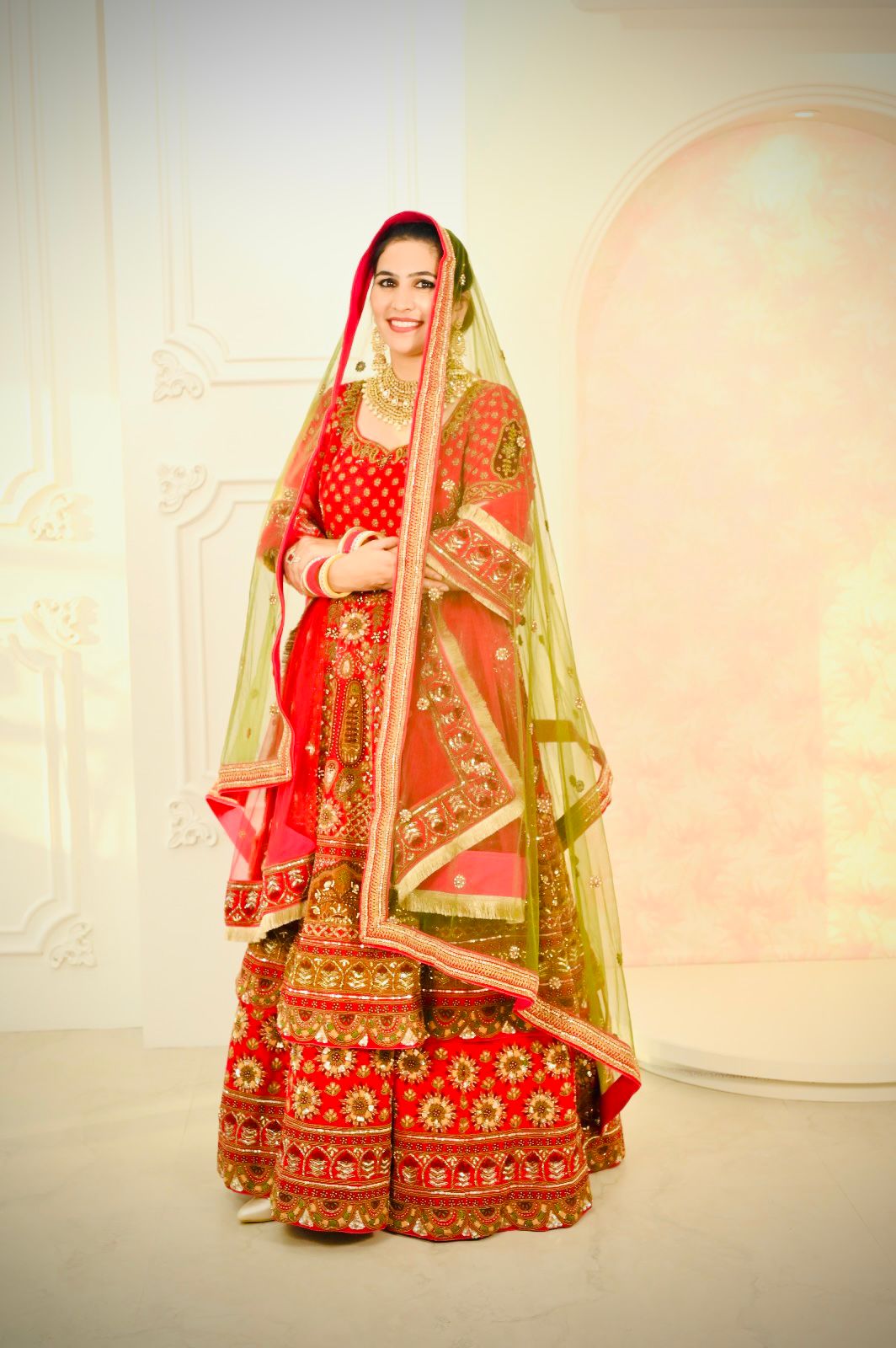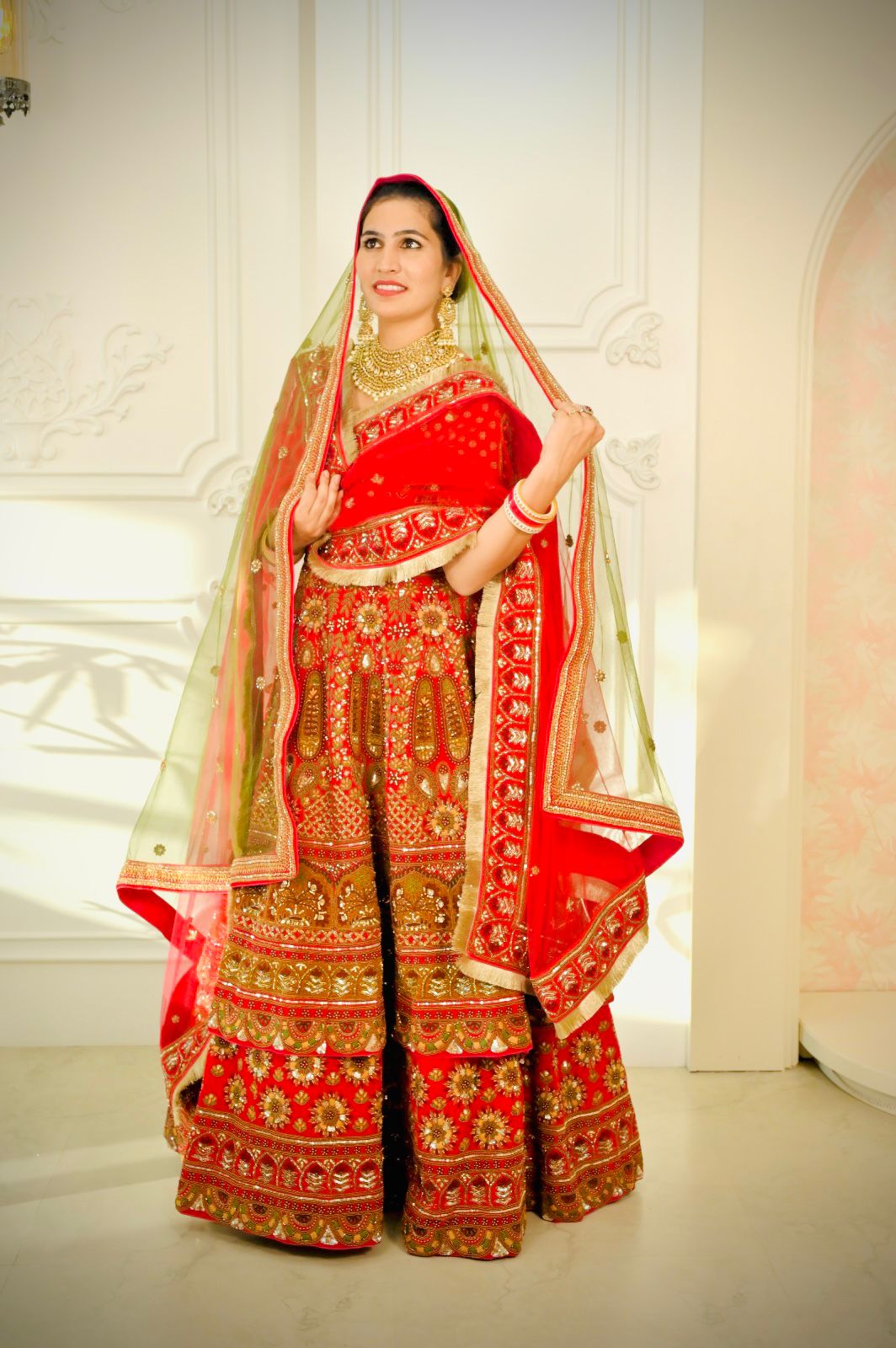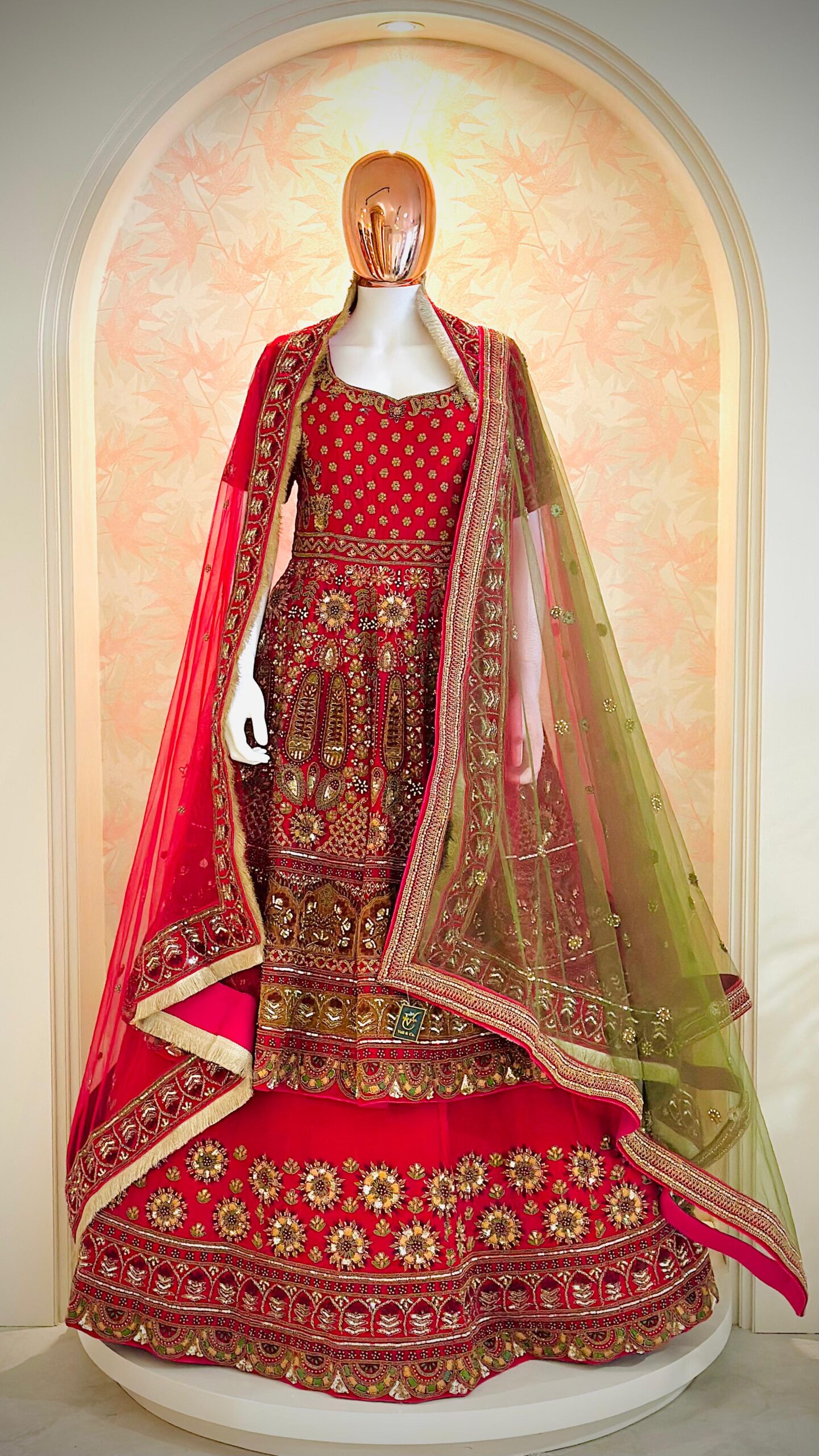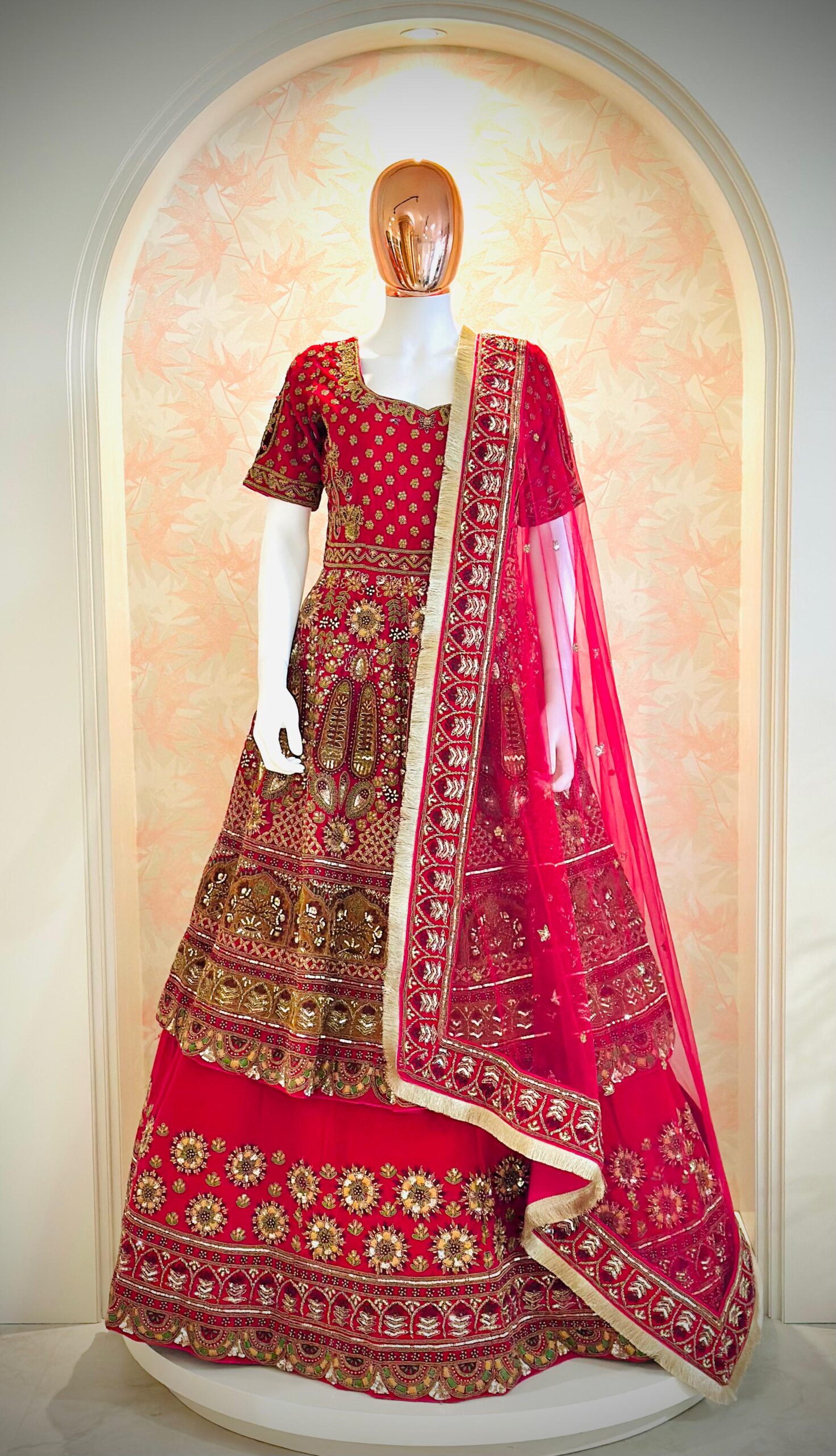 This stunning outfit features an intricately designed traditional ensemble, characterized by vibrant shades of red and gold. The attire consists of a heavy lehenga adorned with elaborate floral patterns and rich embroidery, enhancing its opulent appeal.