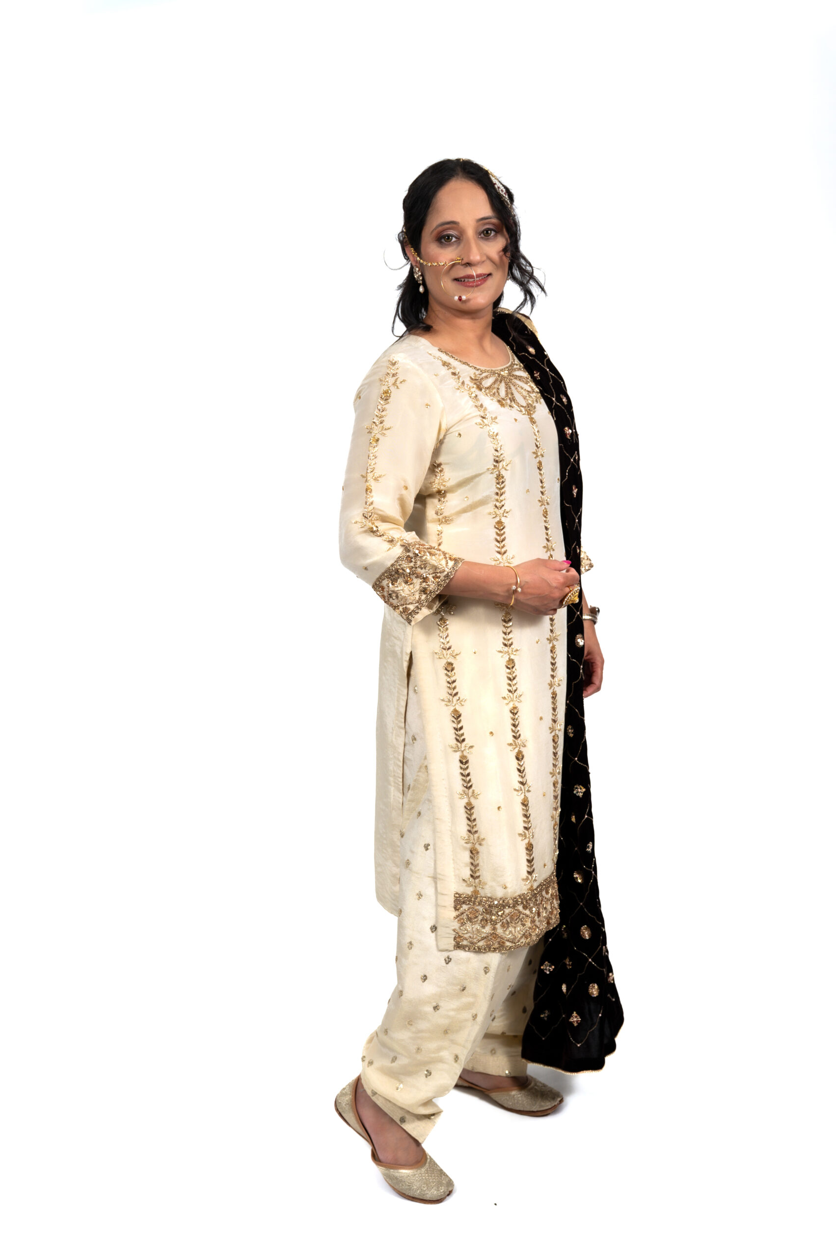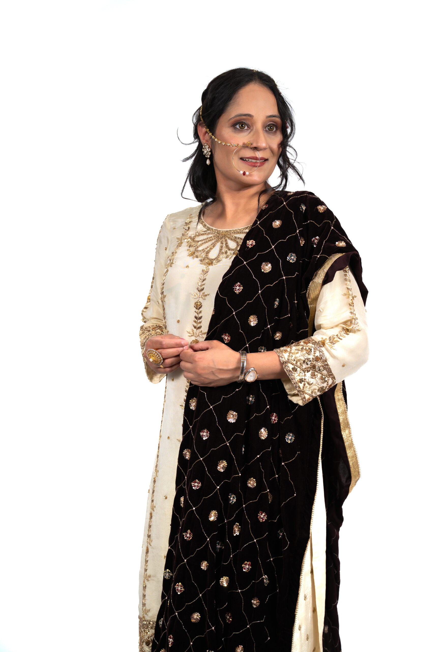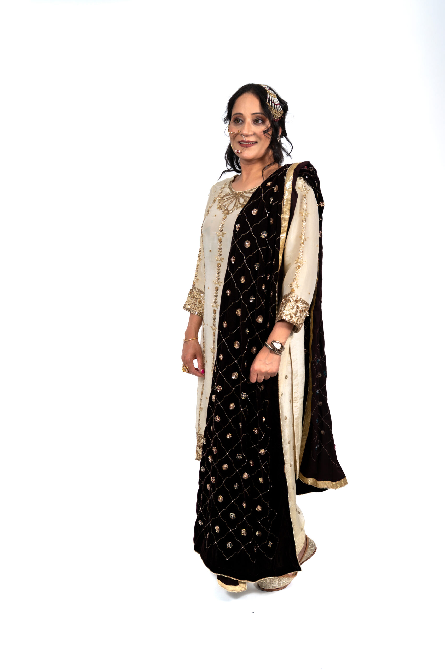 Wrapped in timeless elegance, Shehnaayi is a symphony of gold and velvet. The soft ivory base is adorned with delicate golden embroidery, while the deep black velvet dupatta adds a regal touch. Perfect for wedding festivities or family gatherings, this outfit celebrates tradition with poise and grandeur.