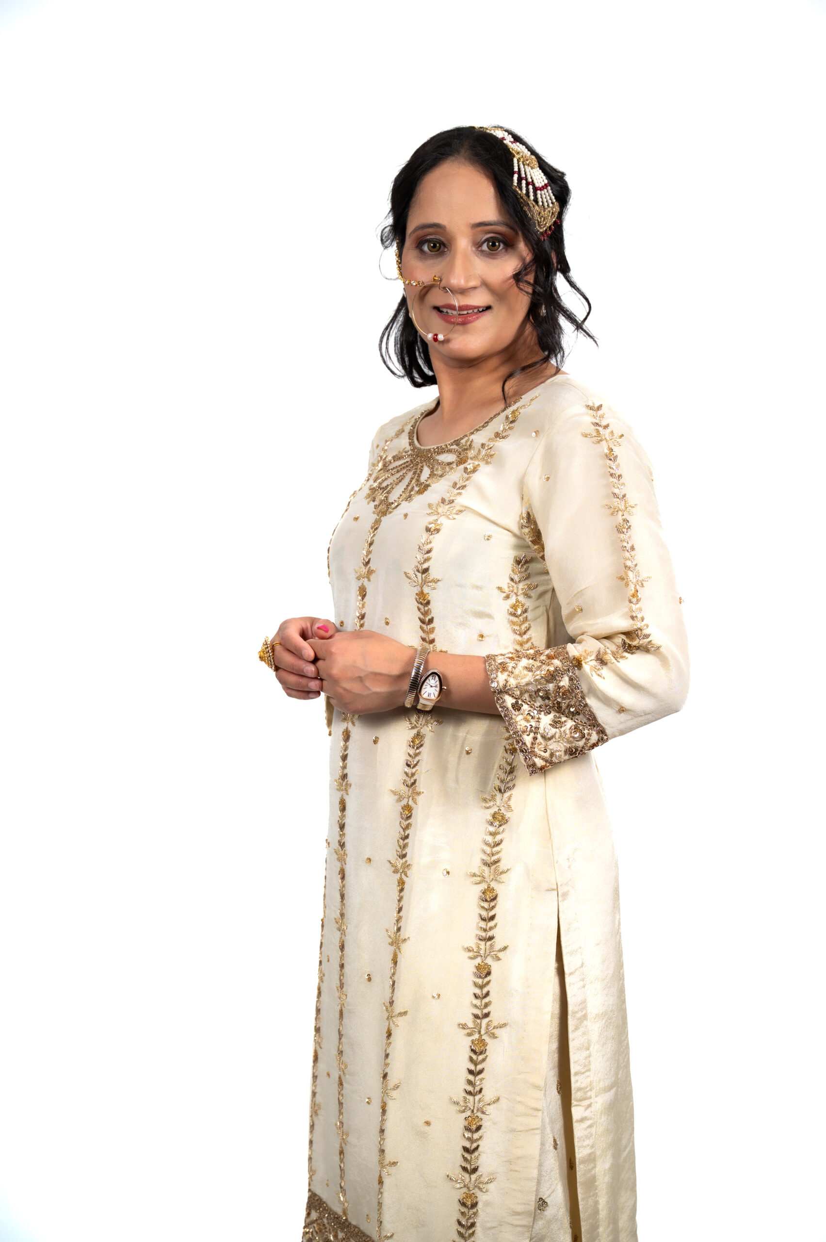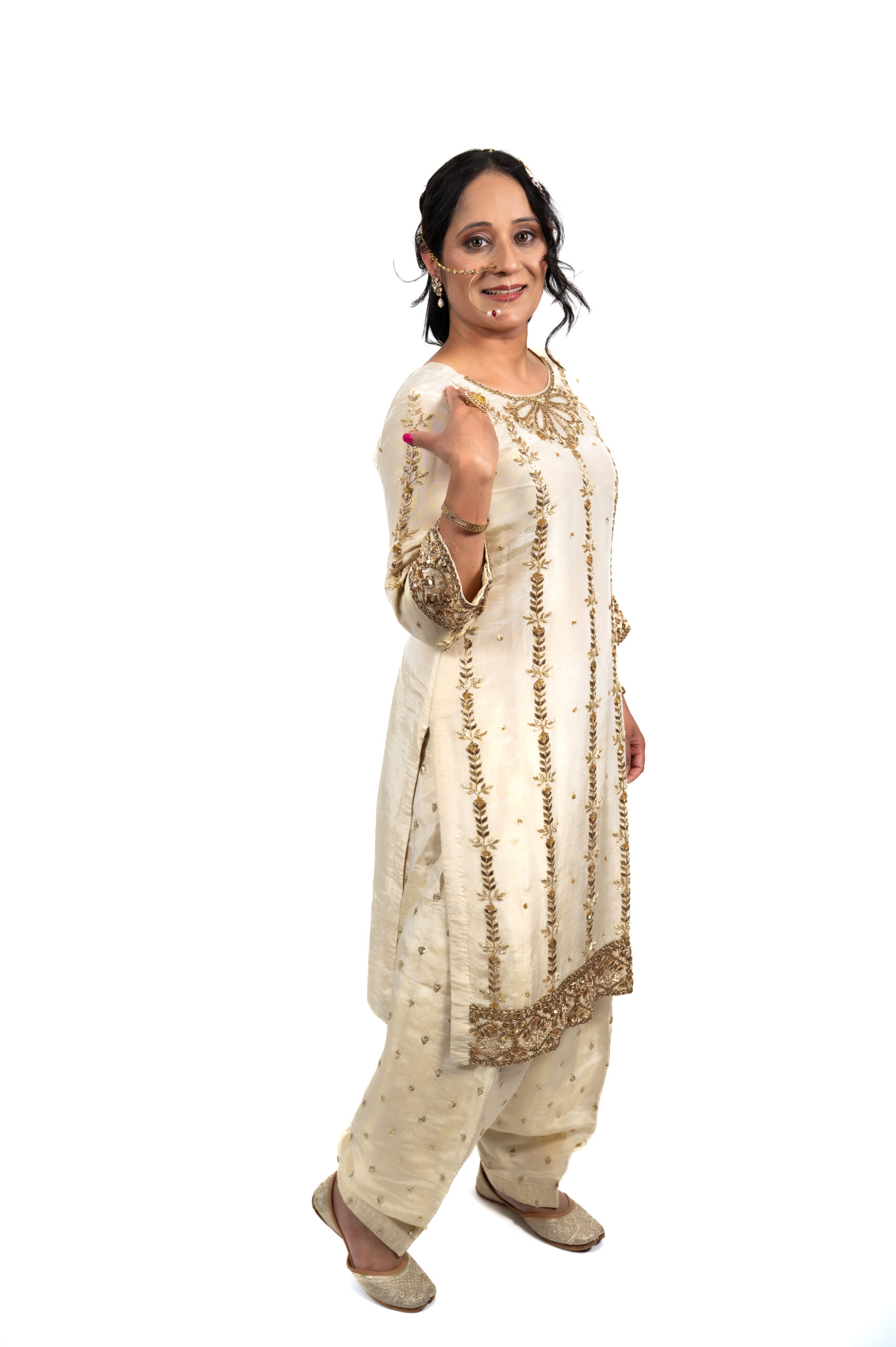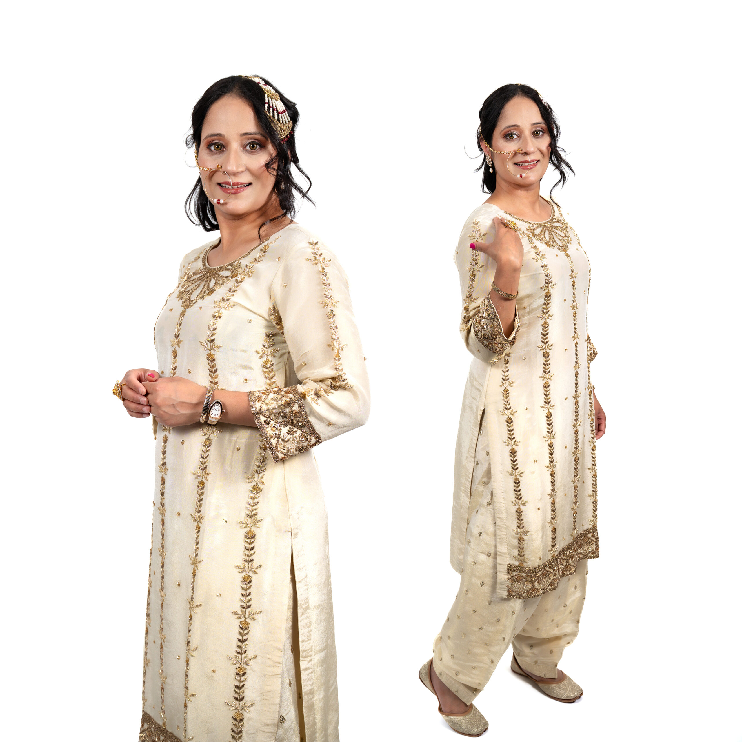Wrapped in timeless elegance, Shehnaayi is a symphony of gold and velvet. The soft ivory base is adorned with delicate golden embroidery, while the deep black velvet dupatta adds a regal touch. Perfect for wedding festivities or family gatherings, this outfit celebrates tradition with poise and grandeur.