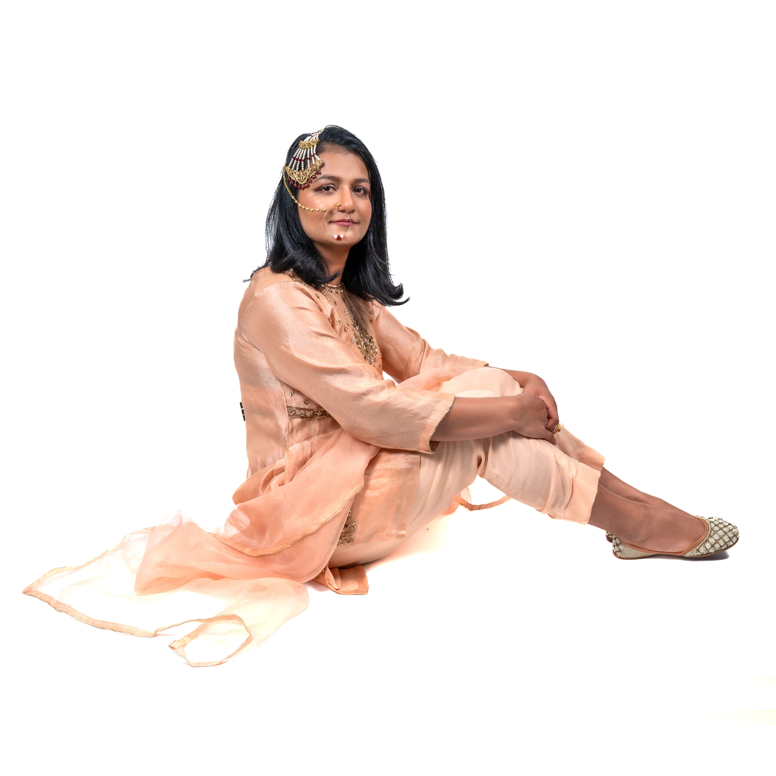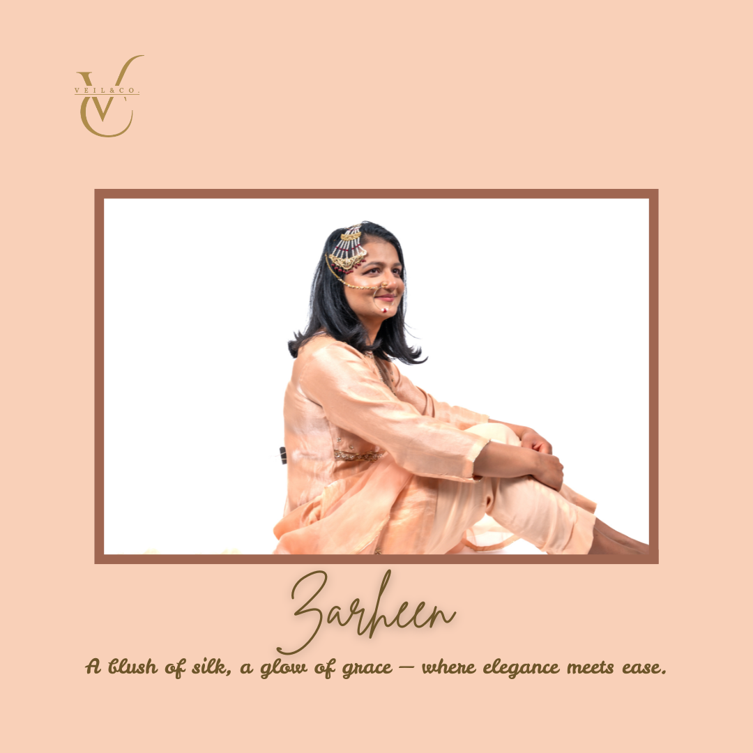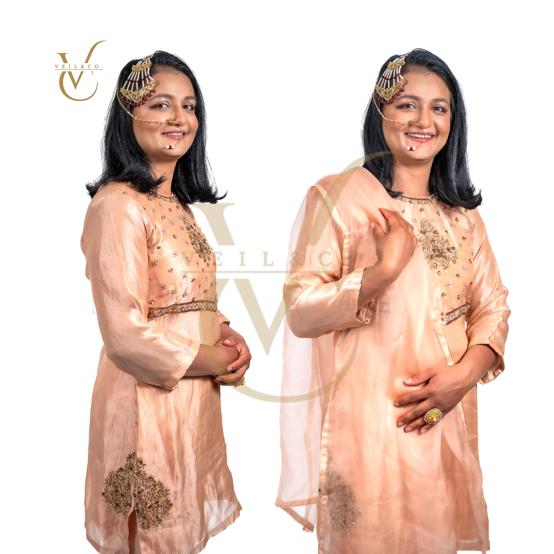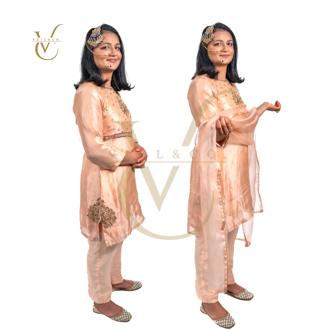 Soft as rose petals and glowing like morning light, Gulaabi Noor is a charming peach silk ensemble adorned with fine golden embroidery and mirror work. The luxurious sheen of the fabric adds elegance, while the classic silhouette and sheer dupatta give it a timeless flair. Perfect for wedding events, mehndi nights, or festive gatherings, this outfit embodies joy, femininity, and quiet strength.